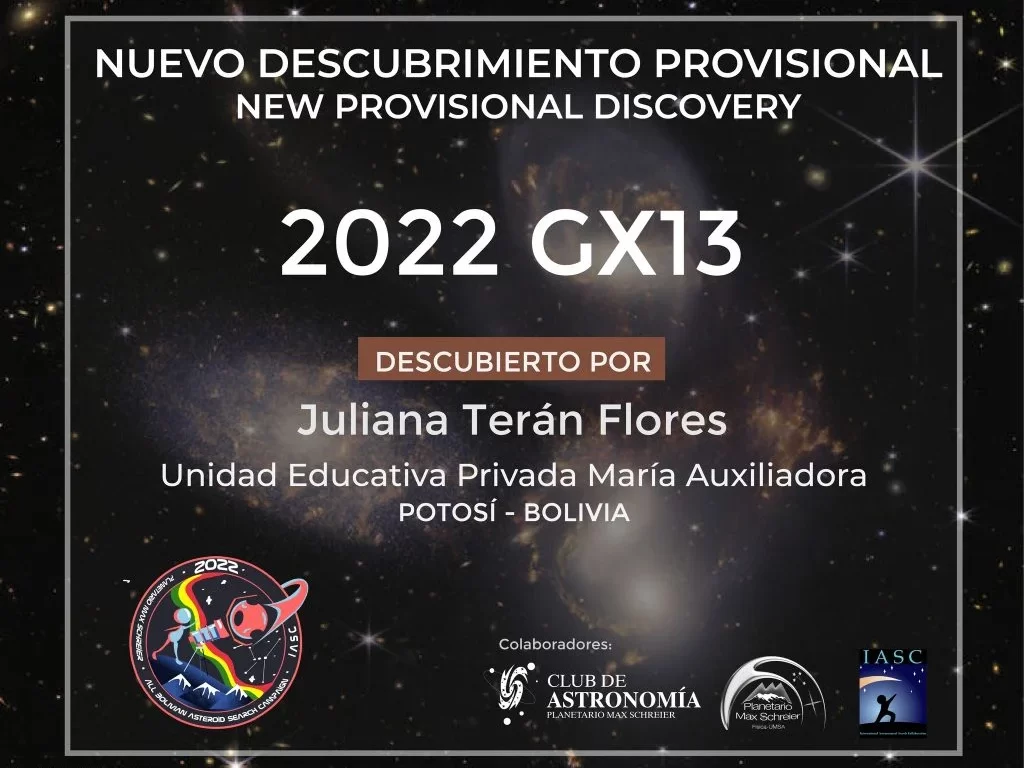 Con 15 años de edad la adolescente Juliana Terán proveniente de Altiplánica Potosí hizo un hallazgo increíble, se trata de un nuevo asteroide denominado 2022 GX13, esto pasó dentro del marco de una campaña que impulsa la astronomía en Bolivia.