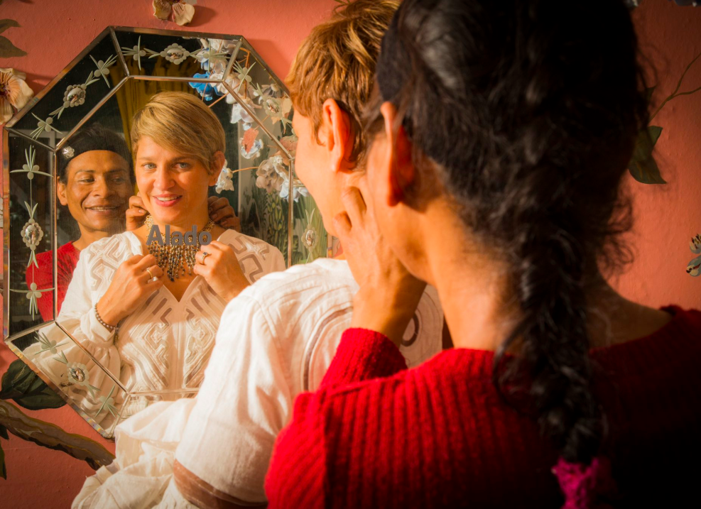 Con Pamela, mujer trans indígena de la comunidad Embera Chami, probándome un collar que ha diseñado recuperando el legado de las artesanías a través de técnicas ancestrales con “shakiras” de barro. ¡AMO SU TRABAJO Y DULZURA!❤️🧡💛💚💙💜#NoMásHomofobia #JusticiaParaPersonasTrans pic.twitter.com/hKH23Zq9a9